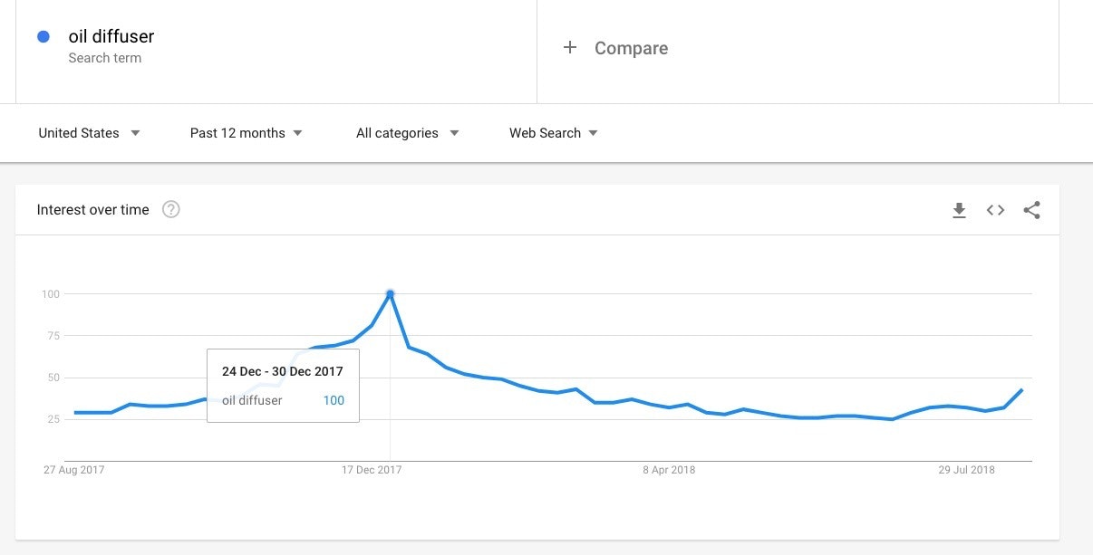 最有趣的一件事是,根据谷歌趋势,人们对石油扩散器的兴趣今年甚至还没有达到顶峰。从历史上看,人们的兴趣在11月(黑色星期五前后)开始高涨,在圣诞节前后达到顶峰。