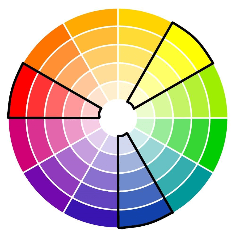 三色配色方案是分裂互补配色方案的变体。这幅构图中的颜色在色轮上的间隔是相等的。取一个等边三角形,把它放在色轮上。每个点上的颜色聚集在一起形成三色方案。