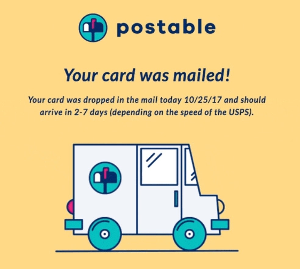 - 发货通知邮件-及时告知客户订单的交货情况。贺卡公司Postables这样做是为了消除顾客的购后焦虑,并与顾客建立信任。