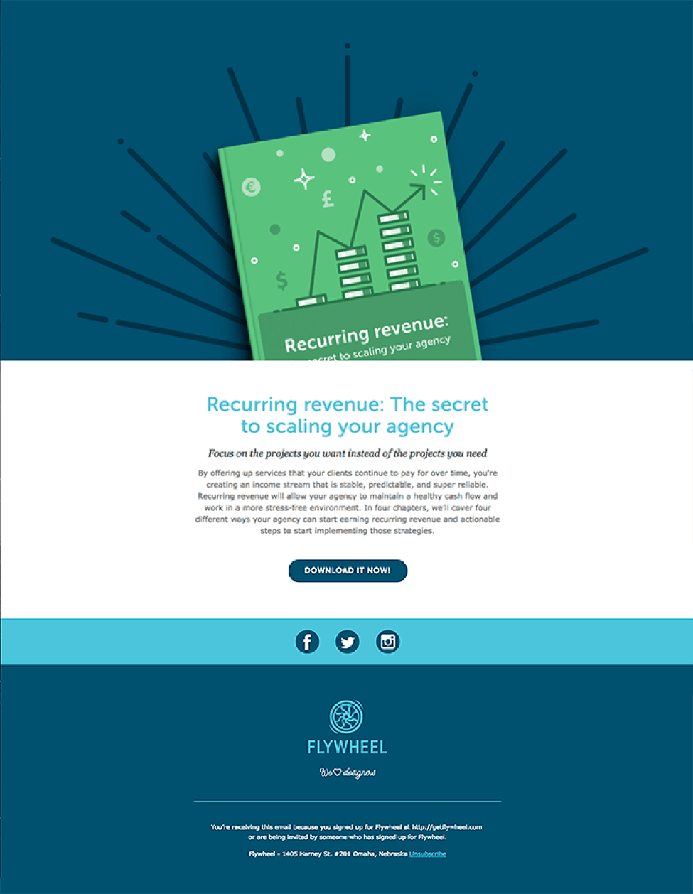 就像我们之前讨论过的,时事通讯是推广公司优质内容的好机会。在这里,管理的WordPress托管公司Flywheel会发送一封电子邮件来鼓励下载它的免费电子书。
