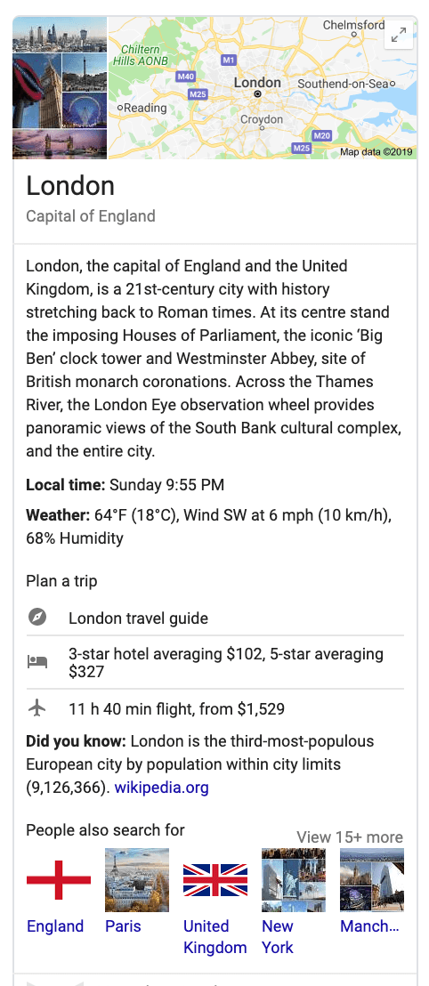 当搜索“伦敦”时,谷歌会返回一个垂直搜索,显示“伦敦要做的事情”: