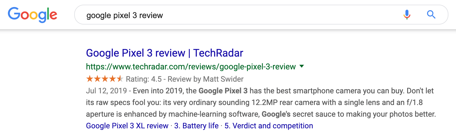 在下图中,你可以看到谷歌Pixel 3的丰富结果,显示客户评分和其他链接: