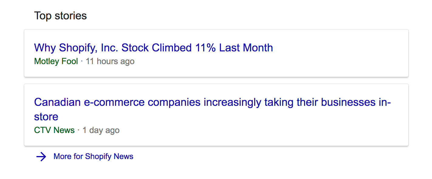 下图显示了一个人们也提问框,包含与搜索查询“Shopify”相关的其他问题: