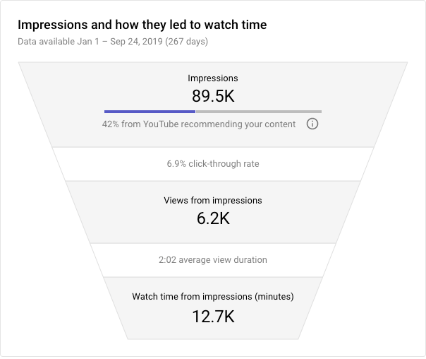 YouTube Analytics提供了一个简单的图表,向你展示了多少印象转化为浏览量,以及这些浏览量与观看时间的关系: