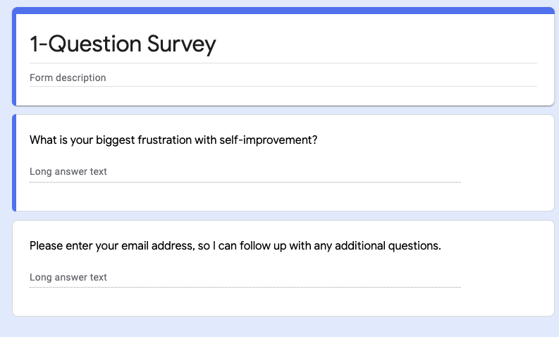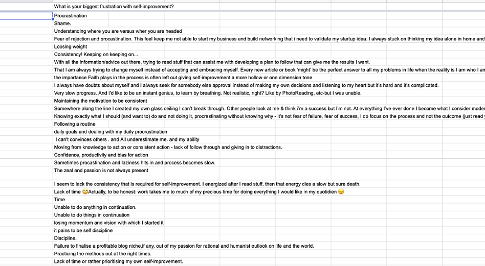 我使用了一个免费的调查(Google表单就可以),并问了一个问题。作为一个励志作家,我的问题是:“你在自我提升过程中最大的挫折是什么?”