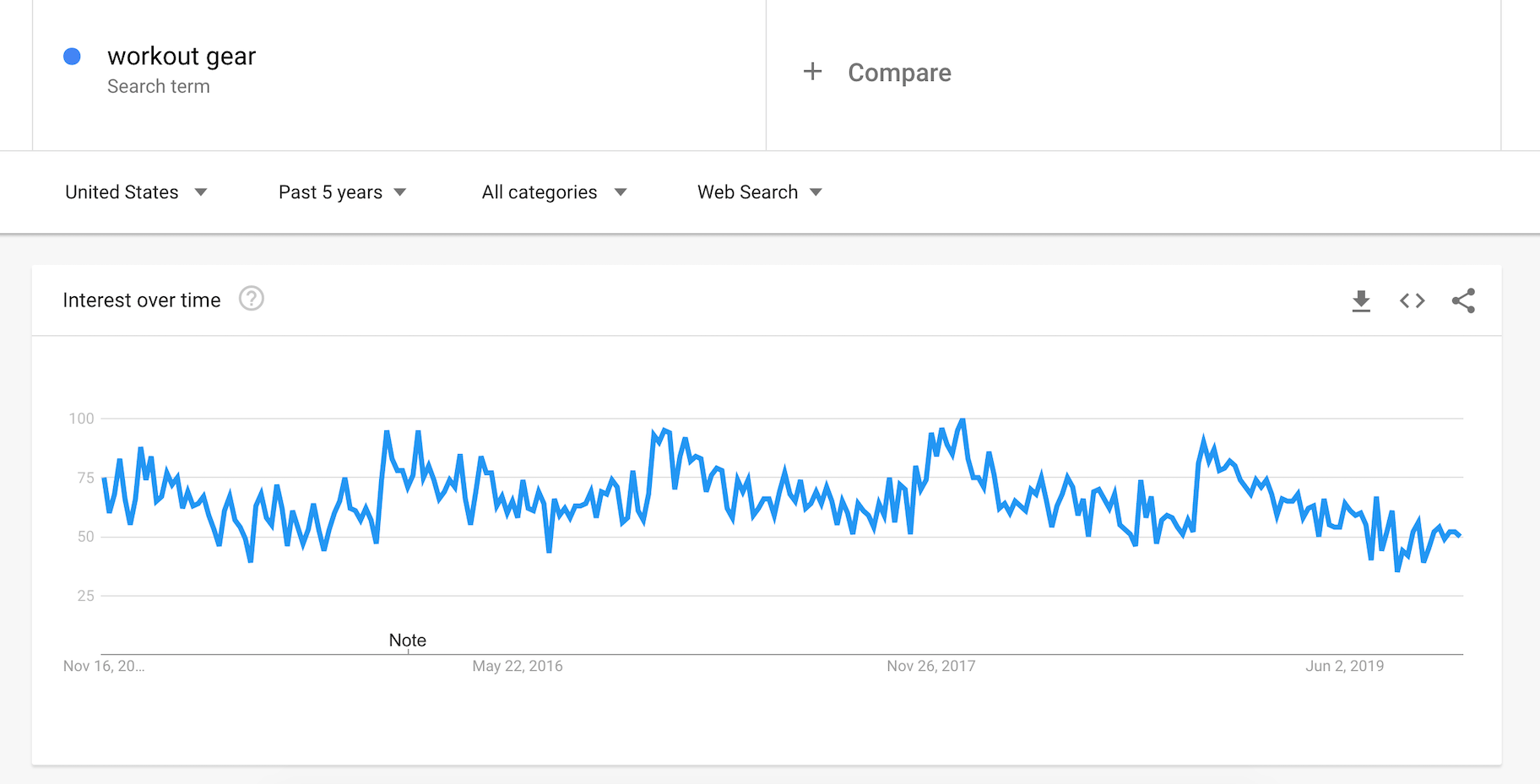 正如你所看到的,“健身装备”一词的搜索量在每年的12月到1月之间持续上升。