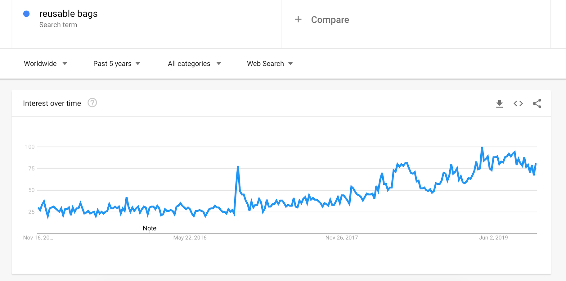 只要看看在全球范围内搜索“可重复使用的袋子”在过去的5年。