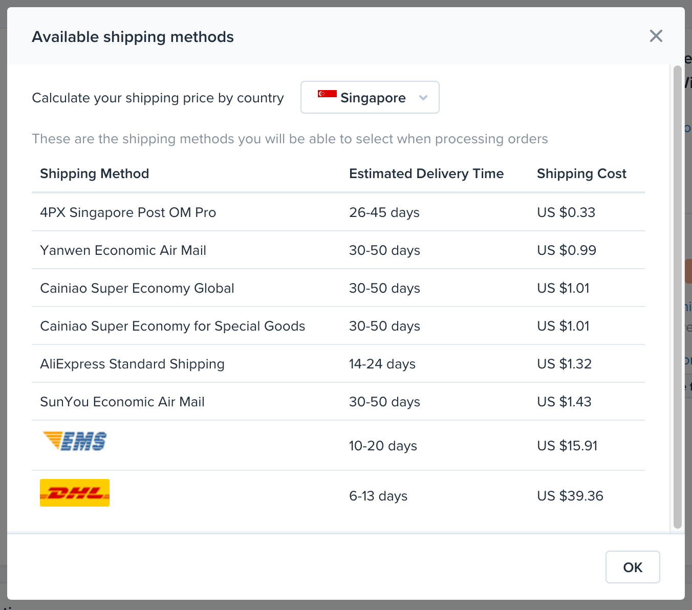 在下面的例子中,我们有燕文经济航空邮件,菜鸟选项,新加坡邮政-以及电子邮包,DHL等。寄往美国的客户,最便宜的选择是燕文经济航空邮件。