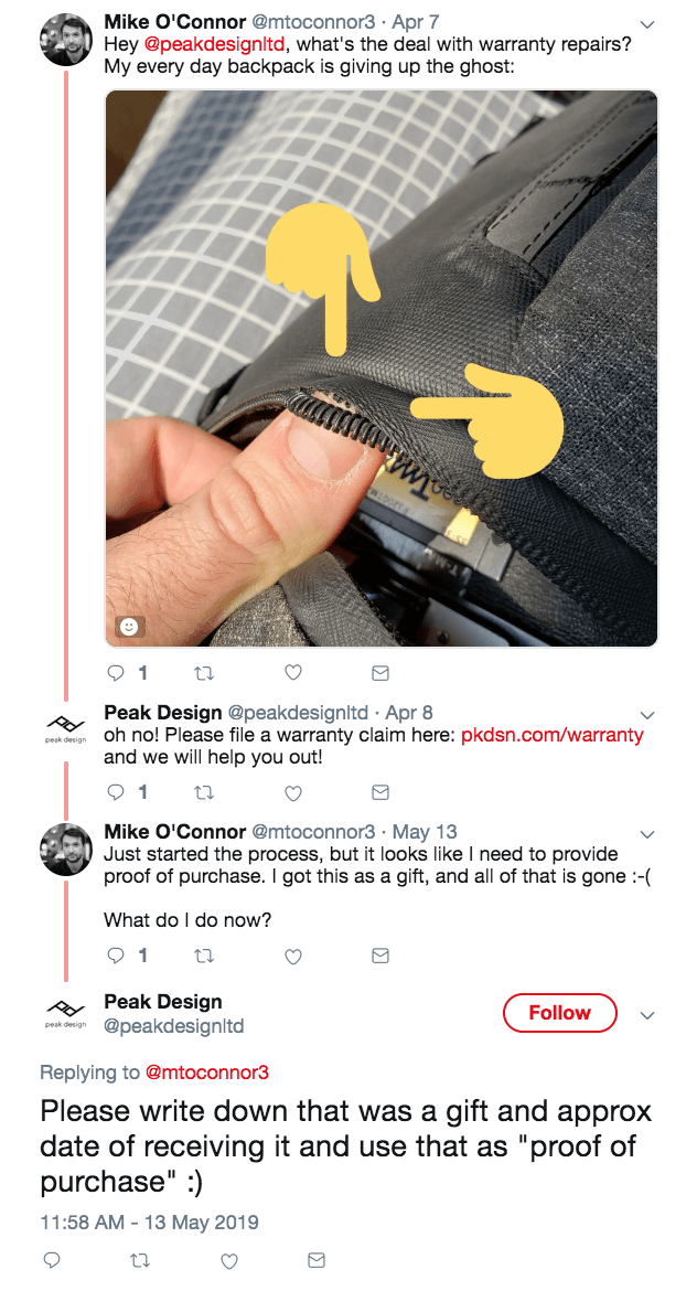 善待和尊重所有用户,即使他们对你的品牌提出了不那么好的批评。一个峰设计顾客对赠送给他们的产品有问题。该品牌提供了支持,以及一个友好的笑脸,帮助客户得到他们需要的东西。