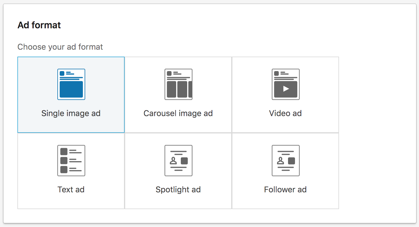选择您想要运行的广告格式:单幅图像、旋转木马图像、视频、文本、聚光灯或追随者广告。