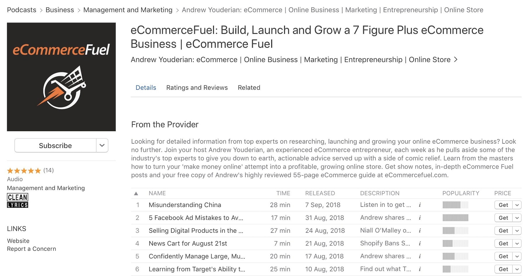 Andrew Youderian是eCommerceFuel主持一个信息丰富的播客,在采访流行的电子商务专家方面做得很好。