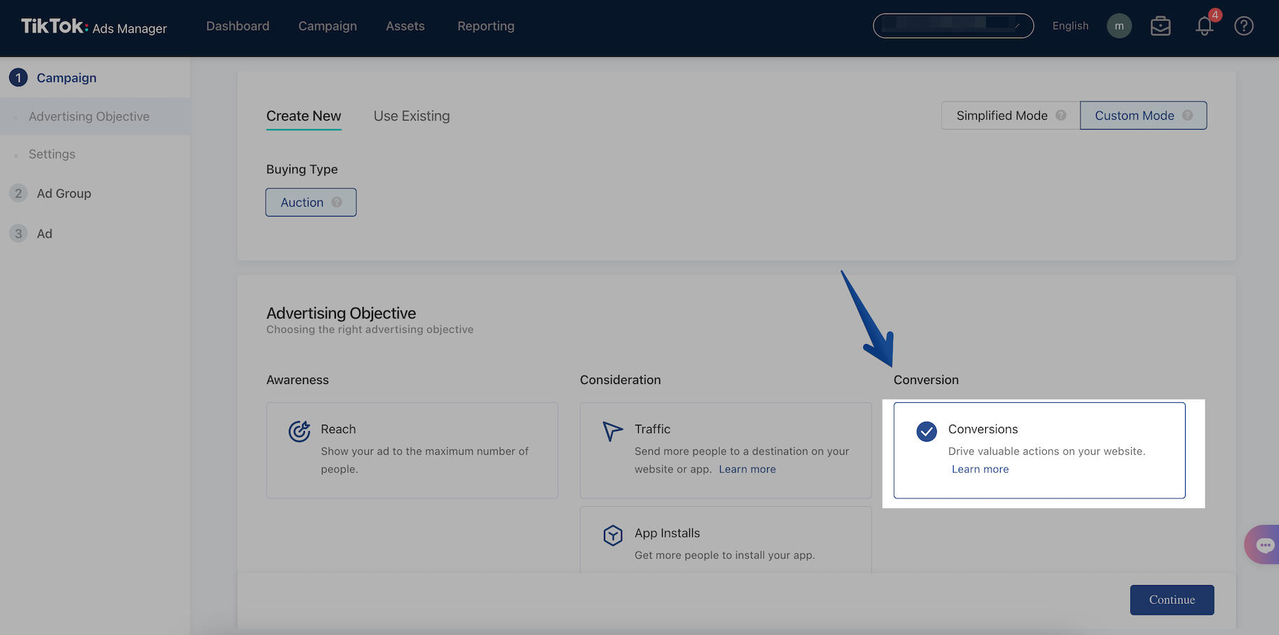 This is as simple as going to your TikTok Ad account and creating a new “Conversions” based campaign.Why conversions? Simply put your goal is to get sales (not traffic, not engagement, or anything else), so just choose “Conversions” and proceed to the next step.