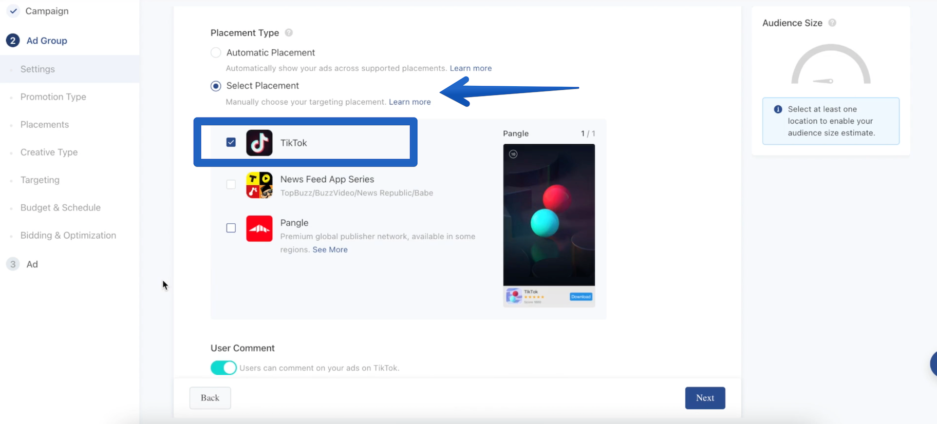 Set yourplacementtoonlyTikTok (uncheck everything else)