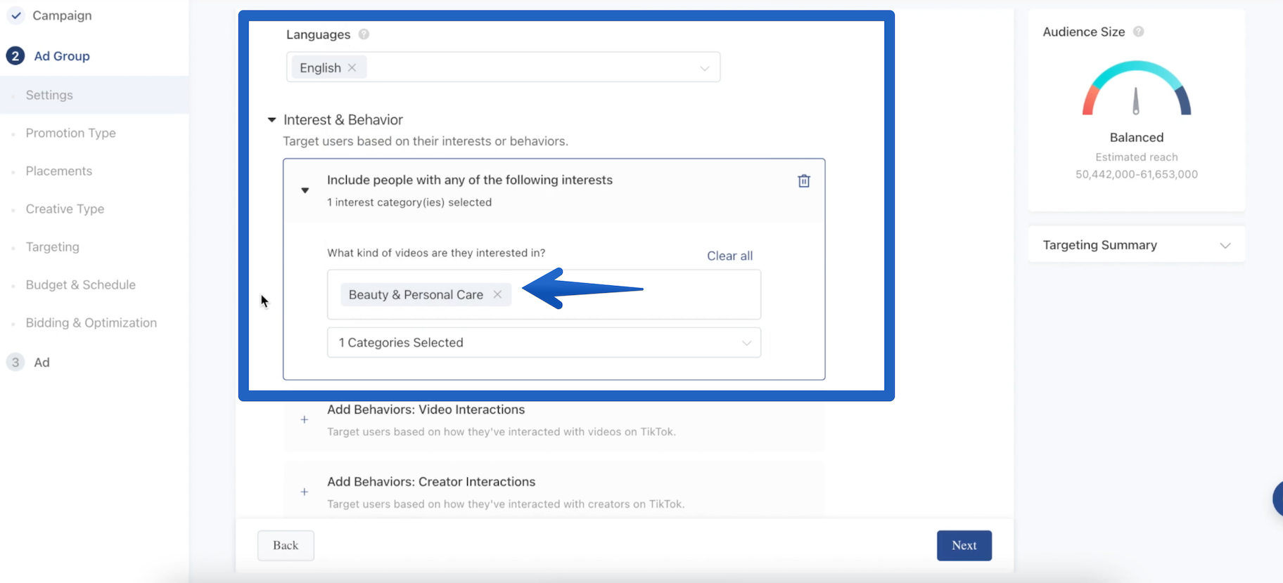 - In the“Interests”section just select the interest that is related to your product niche. On TikTok interests are very broad and they are nothing compared to what Facebook gives you.