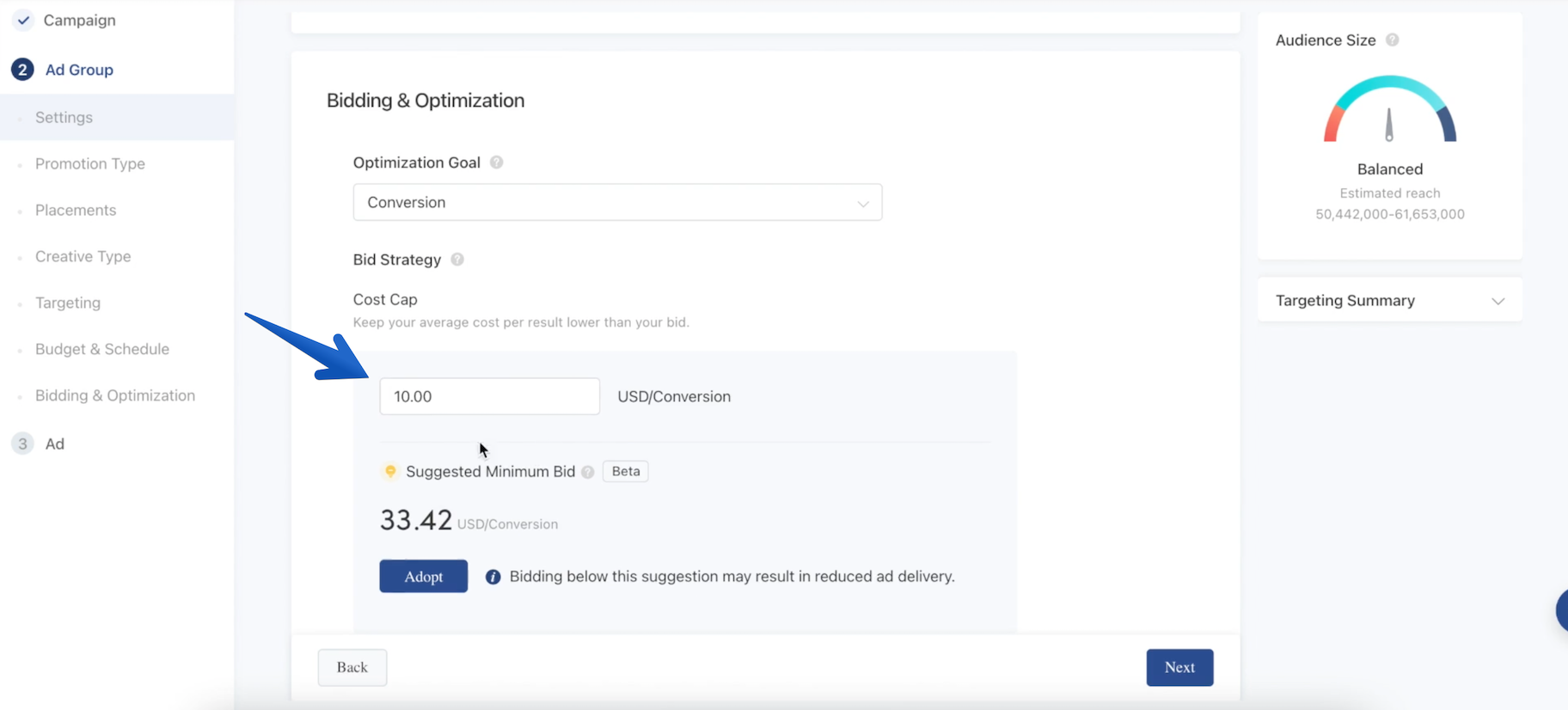 - Cost Cap:this is where you will need to play around with it as this is where you will set how much are you willing to spend per customer. If your product price on your store is $20 and your product cost on AliExpress is $5, just set the ‘Cost Cap’ to like $10 and see how it goes. If it doesn’t spend at all - just increase the bid until $15 (your gross margin).