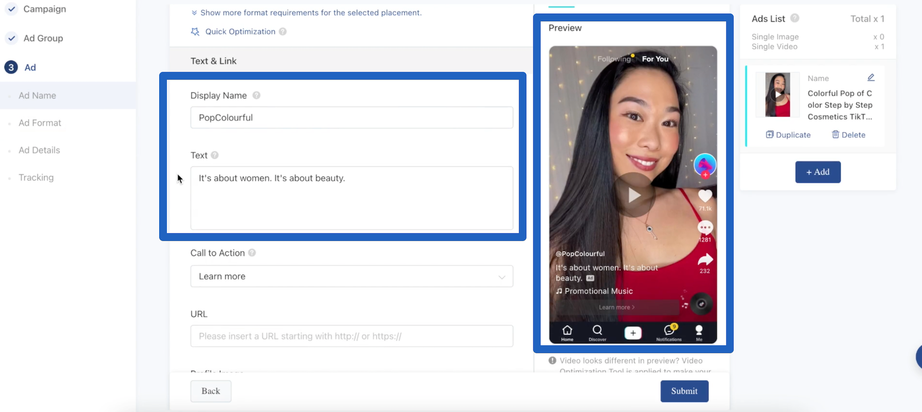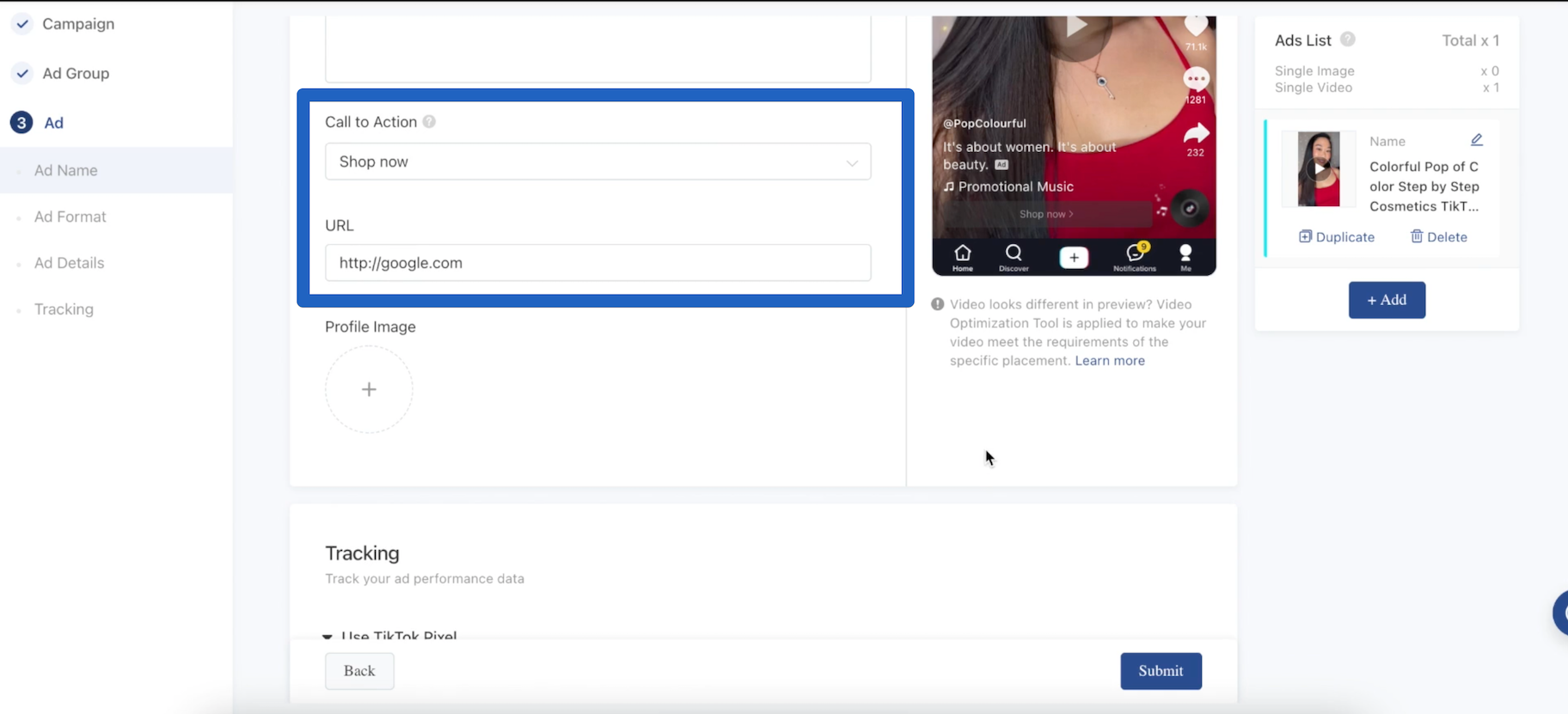 If you have run a Facebook Ad before, you will quickly start to understand the terminology and how everything works here. However, creating an Ad Campaign means that you’ll be creating a new ad where you will target specific demographics of people, as well as advertising your product URL and adding your ad creative (video).
